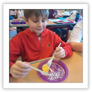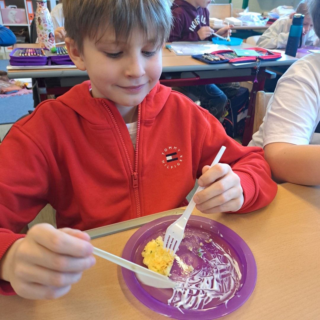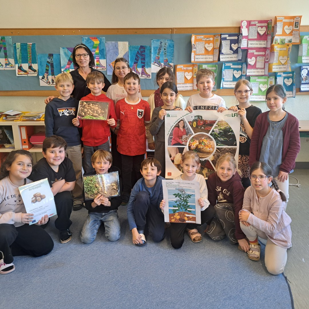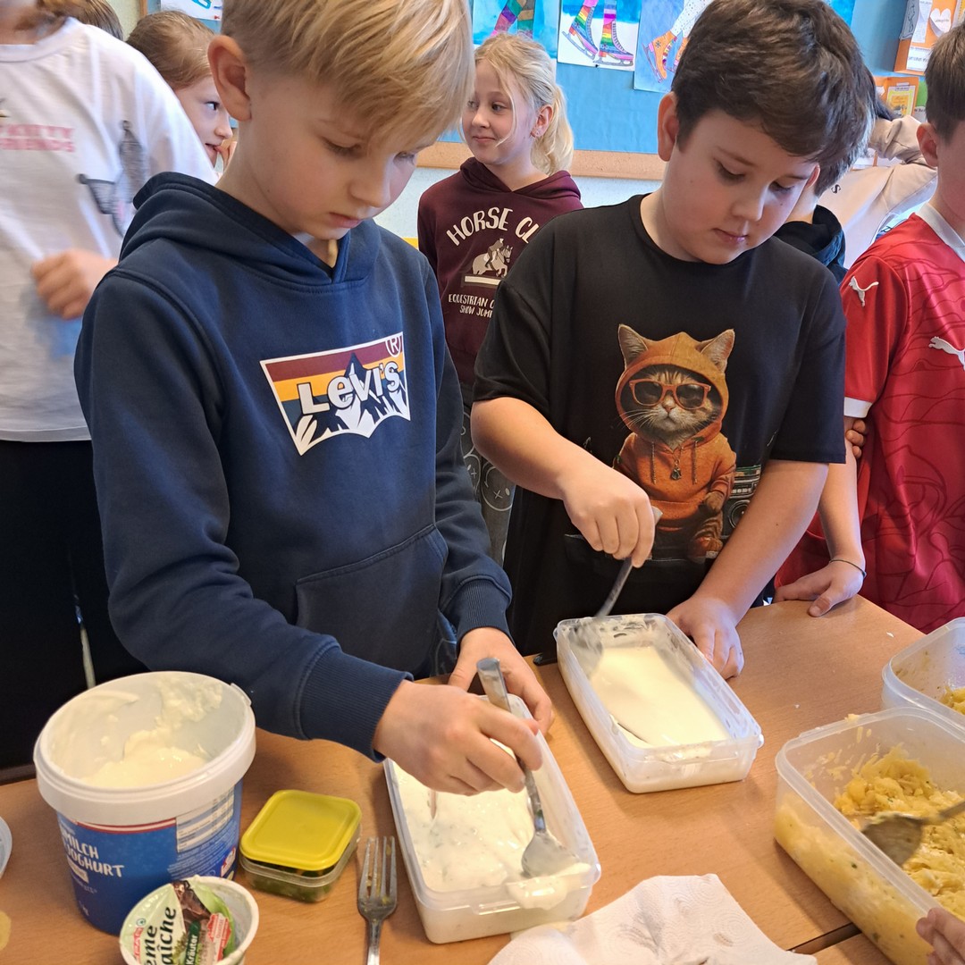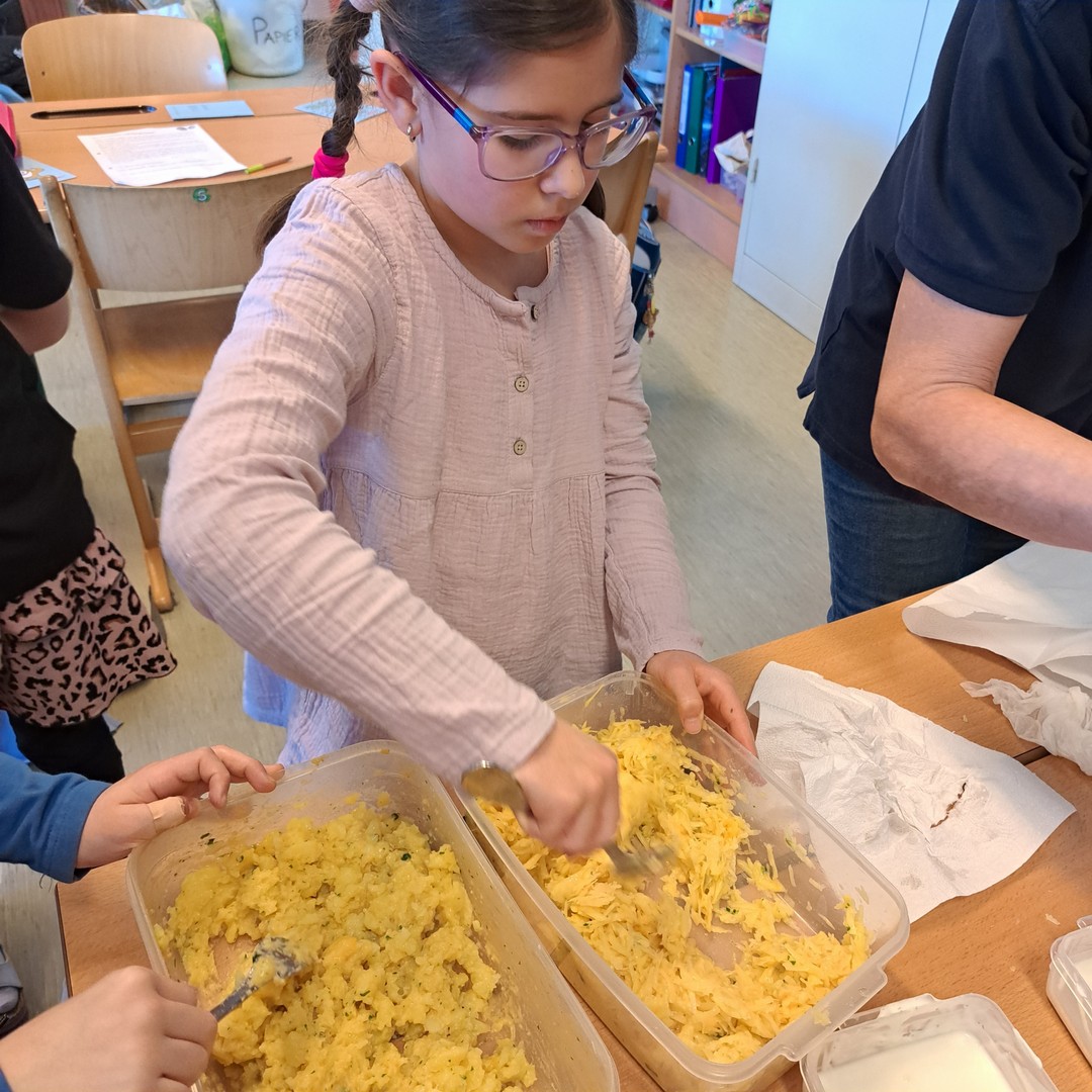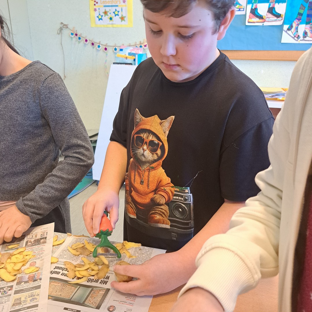 Endlich einmal eine Schulaufgabe, die wir schmecken und genießen können! Die SchülerInnen der 3. Klassen arbeiteten bei einem Workshop mit einer Seminarbäuerin an der Verarbeitung von Erdäpfel, sie schälten und schnitten - köstlich waren die Röstis!