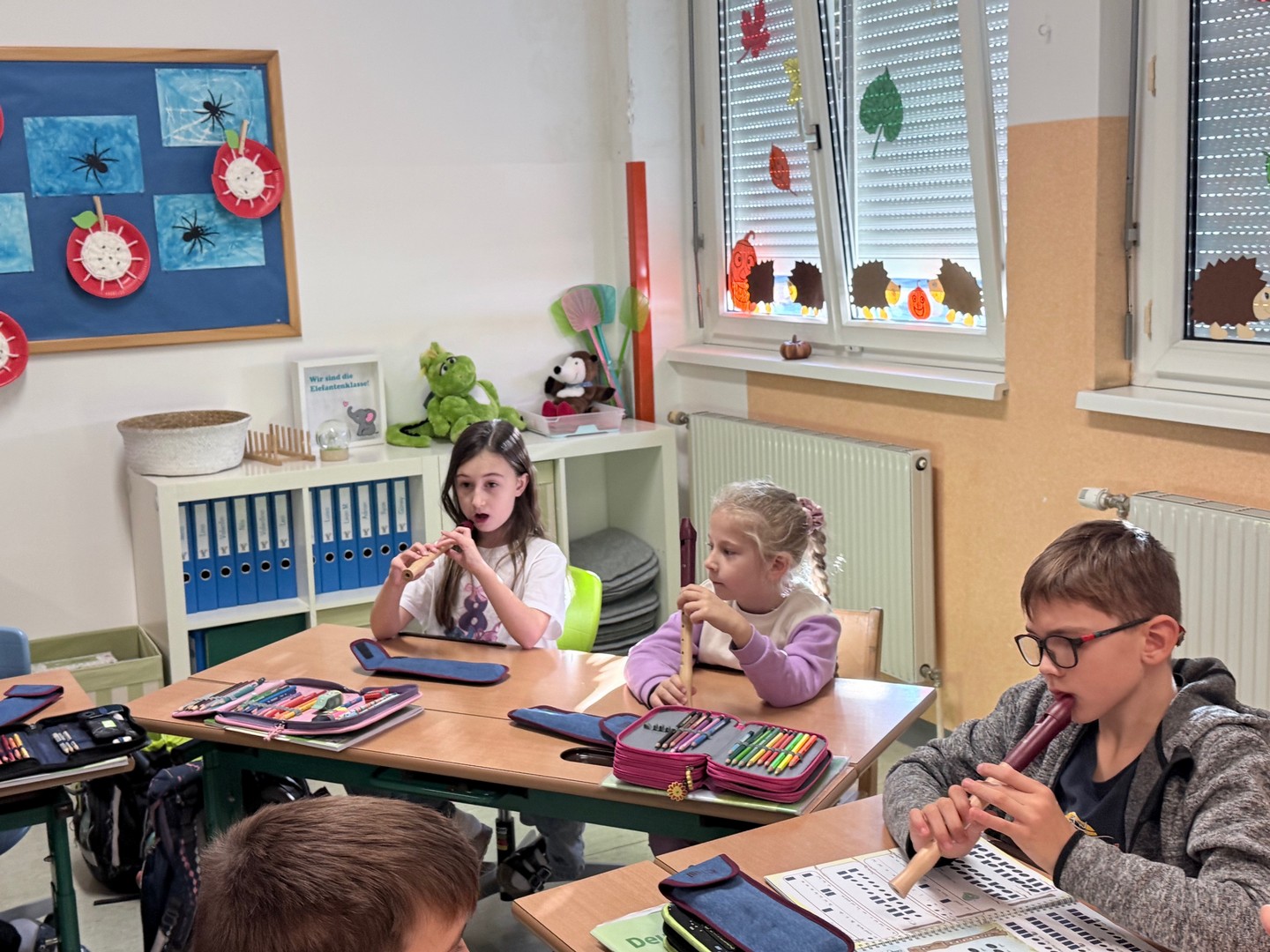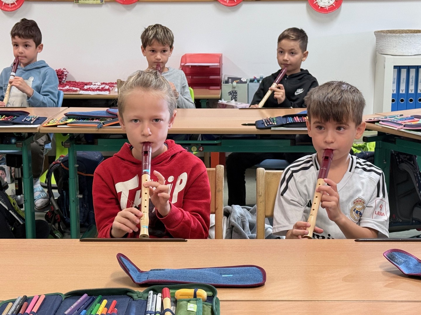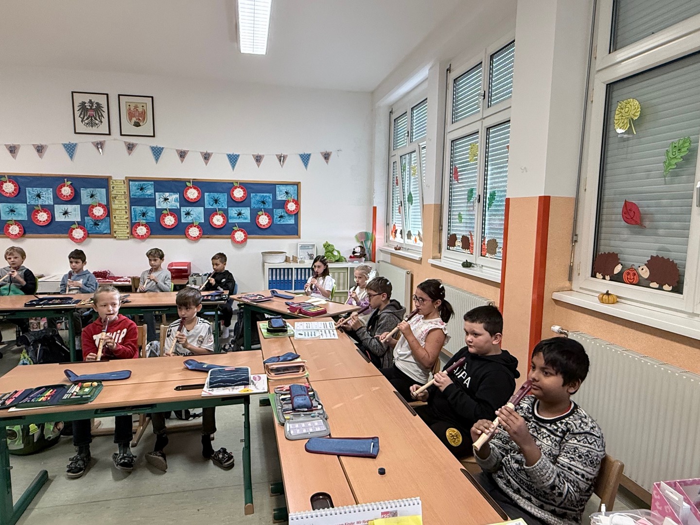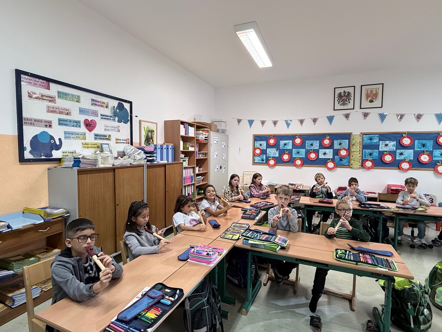 Die SchülerInnen der beiden 2. Klassen lassen ihre Flöten durch das Schulhaus klingen. Im Zuge des Musikunterrichtes kommt Christina von der Musikschule einmal im Monat in die Klassen, um mit den Kindern zu musizieren. Da gibt es viel zu lernen und es macht Spaß!