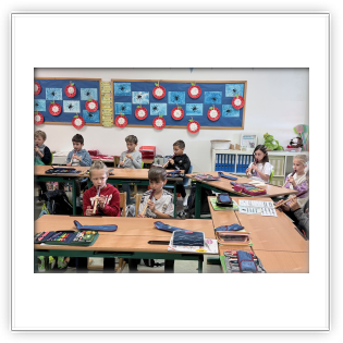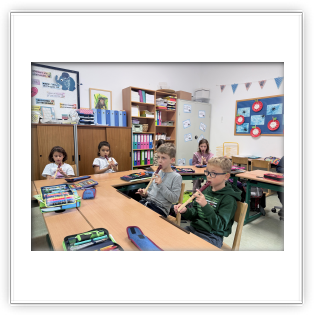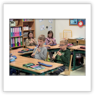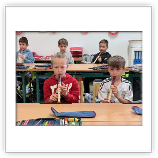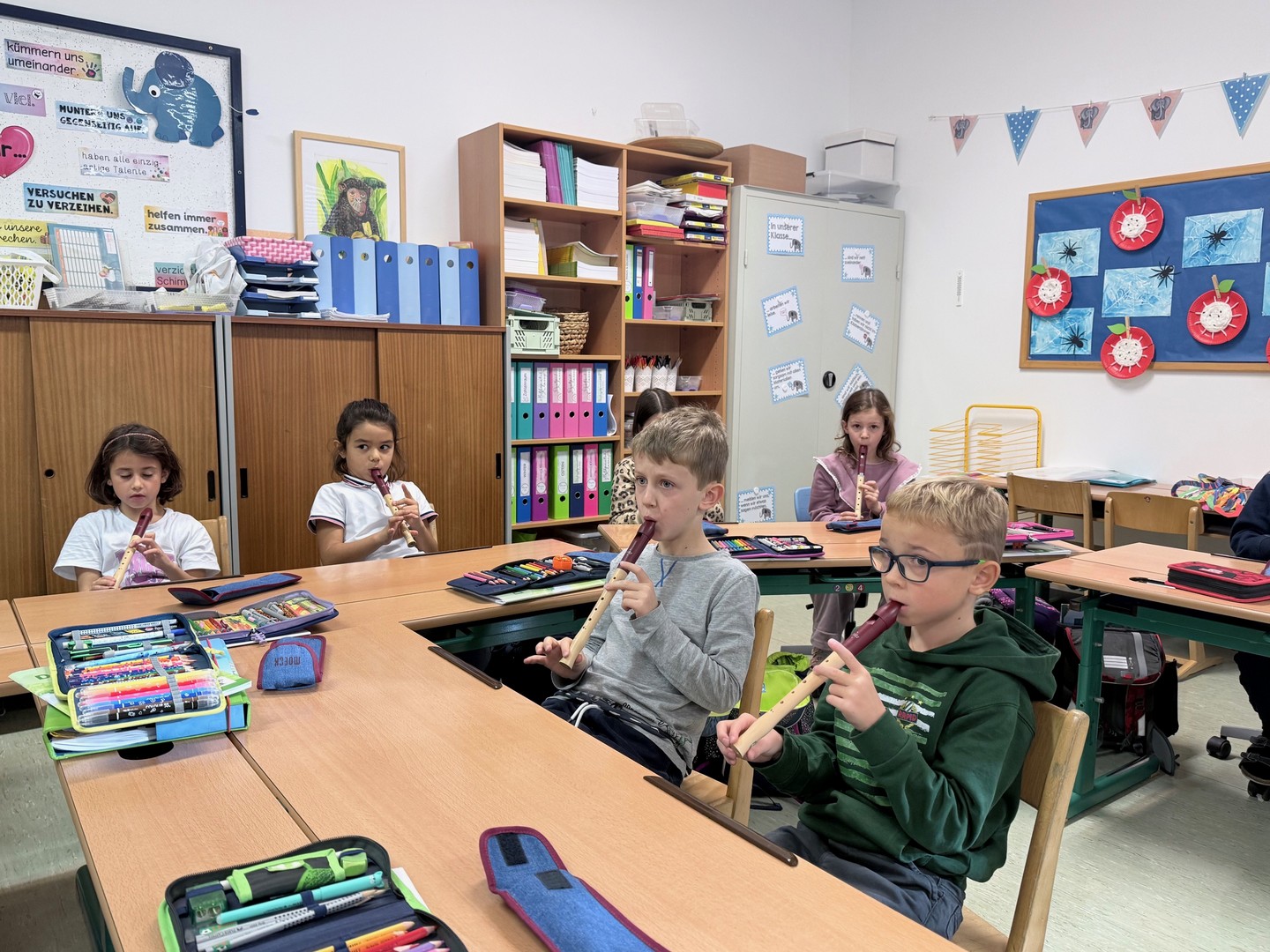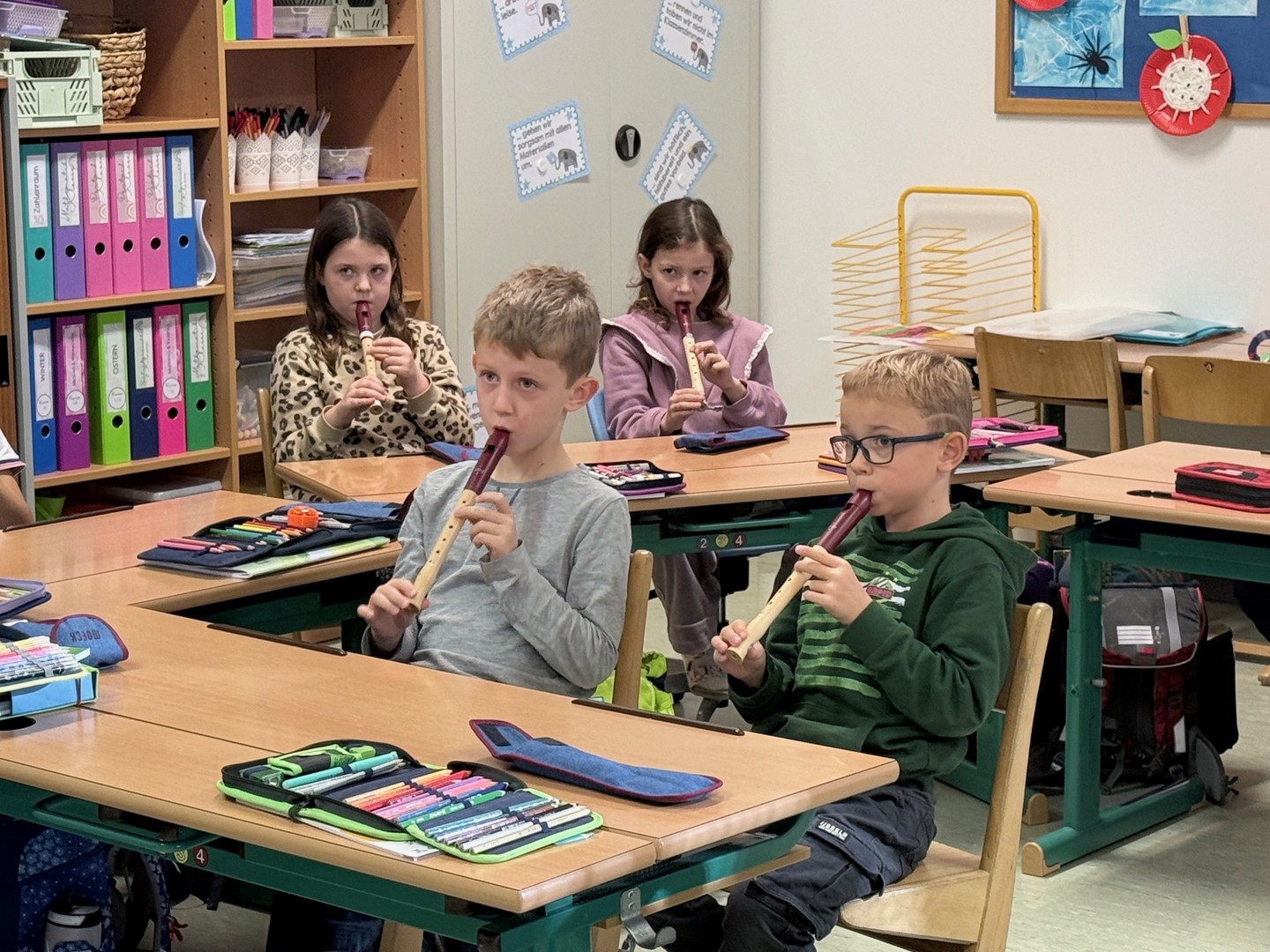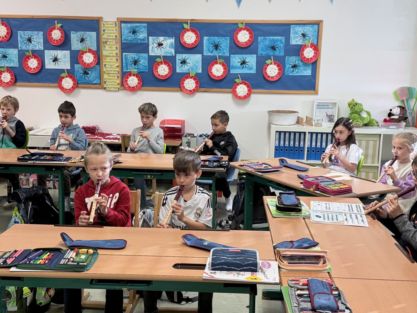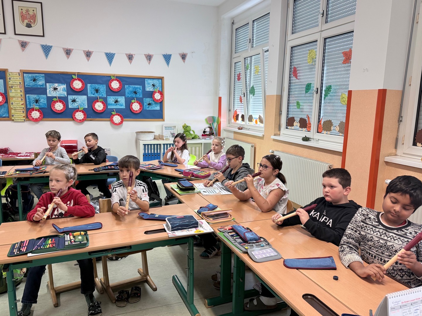 Die SchülerInnen der beiden 2. Klassen lassen ihre Flöten durch das Schulhaus klingen. Im Zuge des Musikunterrichtes kommt Christina von der Musikschule einmal im Monat in die Klassen, um mit den Kindern zu musizieren. Da gibt es viel zu lernen und es macht Spaß!